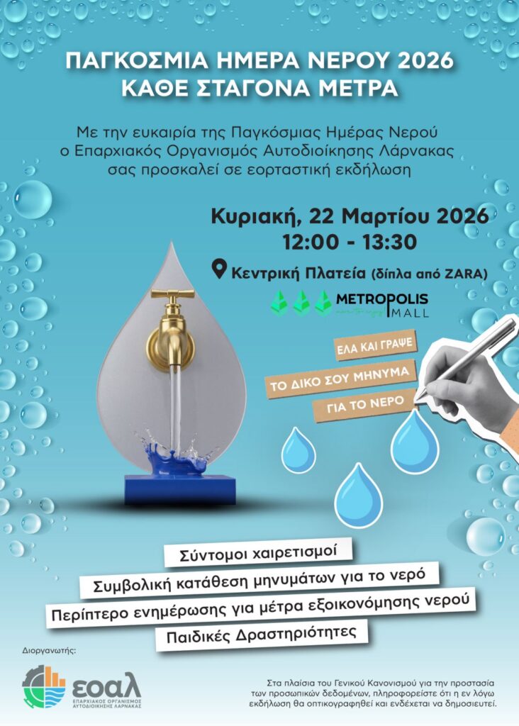 Η Γενική Συνέλευση των Ηνωμένων Εθνών, αναγνωρίζοντας τη σημασία του νερού για φυσική επιβίωση, για κοινωνική και οικονομική ανάπτυξη και για τη διατήρηση του φυσικού περιβάλλοντος, καθιέρωσε την 22η μέρα του μηνός Μαρτίου κάθε χρόνο, ως Παγκόσμια Ημέρα Νερού. Η ημέρα αυτή αποτελεί για μας, στον Επαρχιακό Οργανισμό Αυτοδιοίκησης Λάρνακας, την καλύτερη ευκαιρία να επικοινωνήσουμε με το καταναλωτικό μας κοινό και να του υπενθυμίσουμε την ιδιαίτερη σημασία που έχει το νερό για τον τόπο μας.
