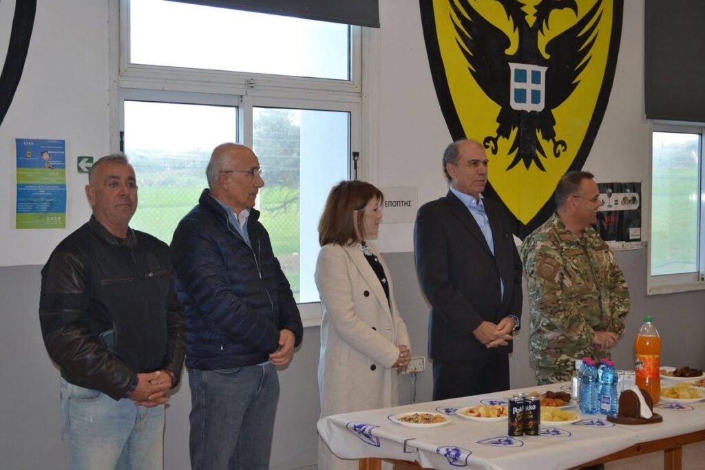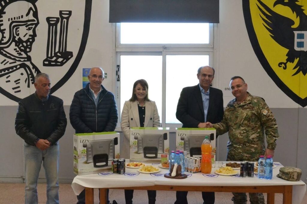 In the spirit of the holidays, a visit was made by Mayor Mr. Christodoulos Partos, Deputy Mayor of Aradippou Ms. Evanthia Savva, as well as representatives of the Welfare Committee and Municipal Councilors Mr. Christakis Mouskos and Mr. Fanos Christou, to the “Toumazou Toumazou” Military Camp in Kellia.