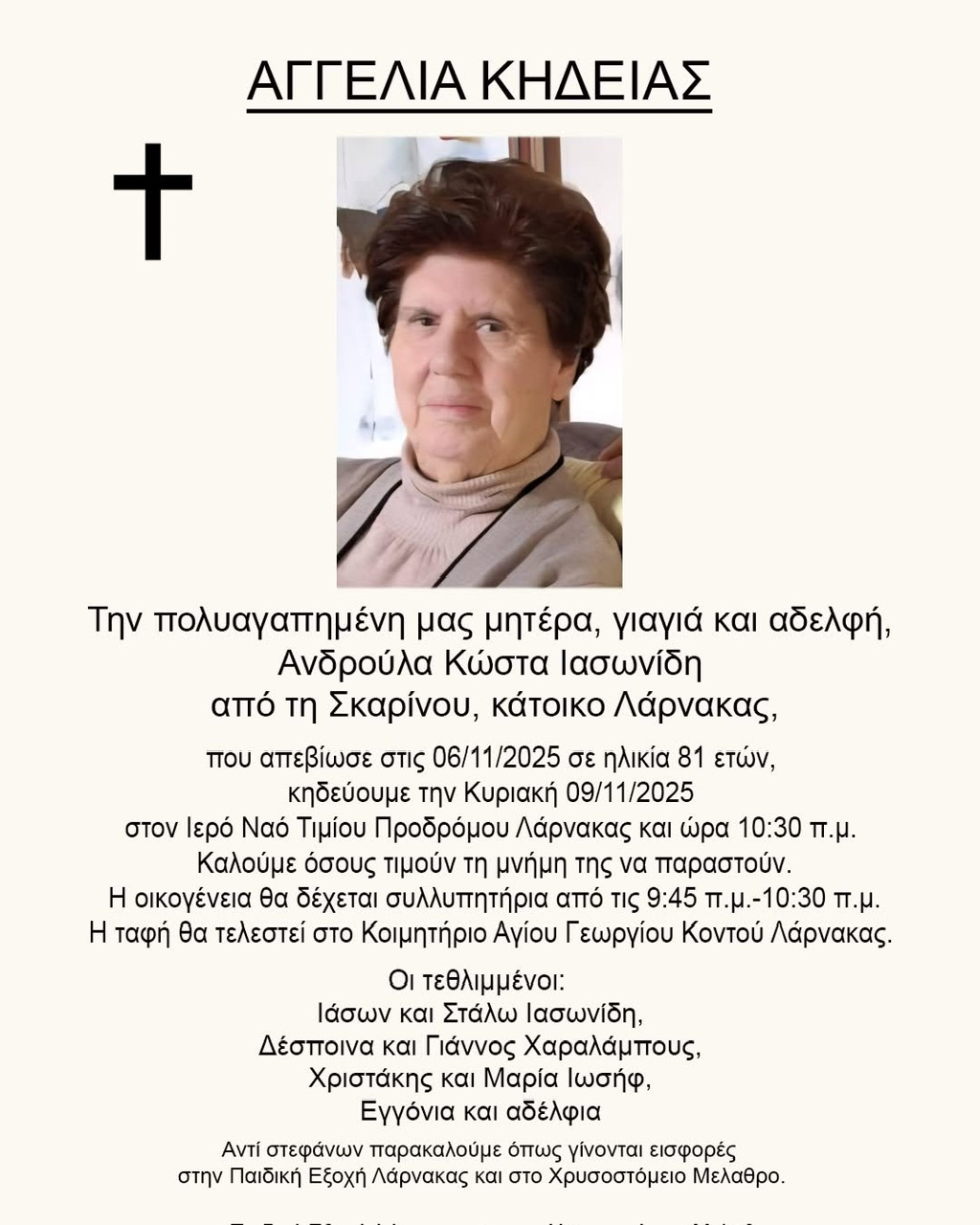 Η οικογένεια παρακαλεί, αντί στεφάνων, να γίνονται εισφορές στην Παιδική Εξοχή Λάρνακας και στο Χρυσοστόμειο Μέλαθρον.