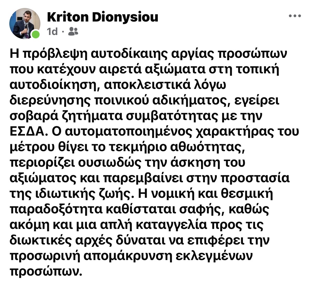 Όπως επισημαίνει σε δημόσια τοποθέτησή του ο ακαδημαϊκός νομικός Δρ Κρίτων Διονυσίου, η αυτοδίκαιη αργία αιρετών αξιωματούχων λόγω απλής διερεύνησης ποινικού αδικήματος εγείρει σοβαρά ζητήματα συμβατότητας με την ΕΣΔΑ. Το βασικότερο ζήτημα αφορά το τεκμήριο αθωότητας, μία θεμελιώδη αρχή του ευρωπαϊκού νομικού πολιτισμού, σύμφωνα με την οποία κάθε πρόσωπο θεωρείται αθώο μέχρι αποδείξεως της ενοχής του από αρμόδιο δικαστήριο.
