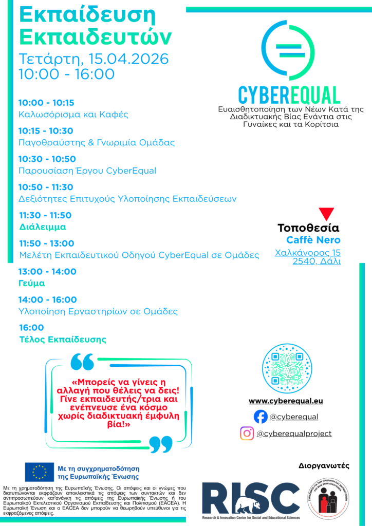 Στο πλαίσιο του έργου CyberEqual – Ευαισθητοποίηση των Νέων Κατά της Διαδικτυακής Βίας Ενάντια στις Γυναίκες και τα Κορίτσια, διοργανώνεται Εκπαίδευση Εκπαιδευτών (Train the Trainers) με στόχο την ενδυνάμωση νέων εκπαιδευτών/τριών για την πρόληψη και καταπολέμηση της διαδικτυακής βίας.