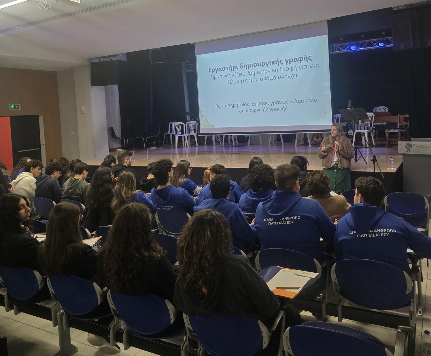 Ξεχωριστή στιγμή της εκδήλωσης αποτέλεσε το εργαστήρι δημιουργικής γραφής «Πράσινες Λέξεις», το οποίο συντόνισε η δημοσιογράφος (Αρχισυντάκτρια SkalaTimes) και δασκάλα δημιουργικής γραφής Γιώτα Δημητρίου. Στο εργαστήρι αυτό η δημιουργική γραφή συναντήθηκε με την περιβαλλοντική ευαισθησία. Οι μαθητές έδωσαν δύναμη στις λέξεις τους, μετατρέποντας σκέψεις και συναισθήματα σε μικρές ιστορίες και μηνύματα για τη Μητέρα Γη. Με ευαισθησία αλλά και ωριμότητα, κατέγραψαν το δικό τους όραμα για έναν πλανήτη που αξίζει να προστατευτεί, αποδεικνύοντας πως η φωνή της νεολαίας μπορεί να γίνει δύναμη ουσιαστικής αλλαγής.