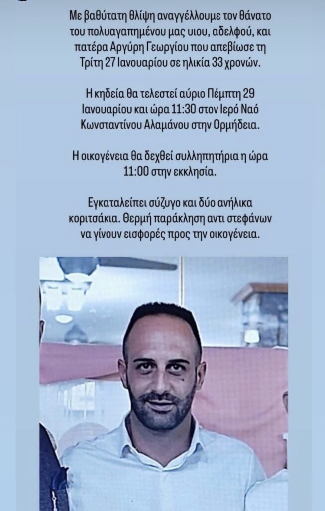 Today at 11:30 a.m., at the Holy Church of Agios Konstantinos Alamanos in Ormideia, the final farewell will be given to 33-year-old Argyris Georgiou, whose sudden passing has plunged Ormideia into mourning.