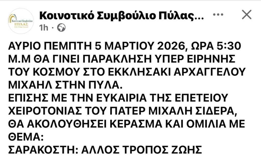 Αύριο πέμπτη 5 Μαρτίου 2026, ώρα 5:30 μ.μ. θα γίνει παράκληση υπέρ ειρήνης του κόσμου και ιδιαίτερα της πατρίδας μας, στο εκκλησάκι Αρχαγγέλου Μιχαήλ στην Πύλα.
