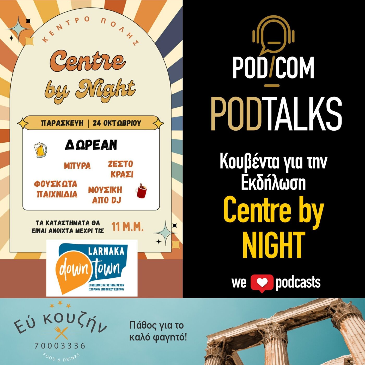 В передаче Pod Talks Яниса Дианеллу приняли участие Мария Кириаку, Константинос Лагу и Йота Димитриу, которые рассказали о большом мероприятии Center by Night, которое состоится в пятницу, 24 октября, в центре Ларнаки — с 19:00 и до поздней ночи.