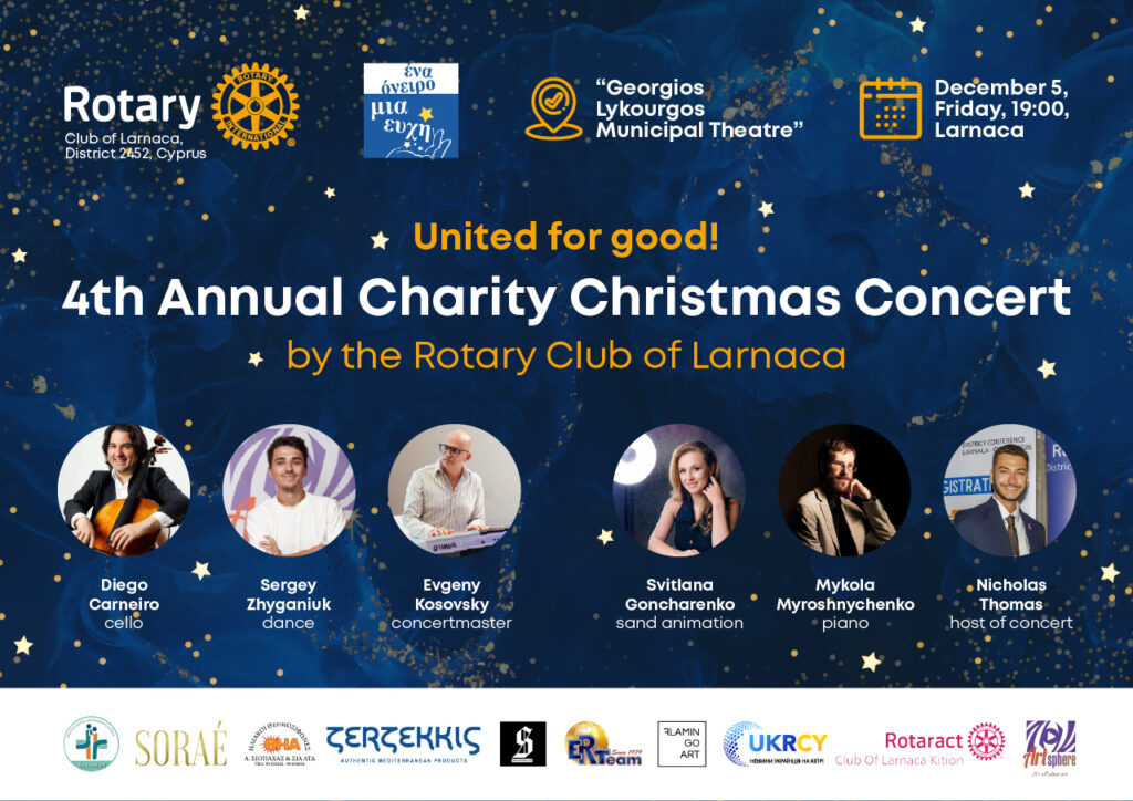 The Rotary Club of Larnaca will host its 4th Annual Charity Christmas Concert by the Rotary Club of Larnaca at the G. Lykourgos Municipal Theater.