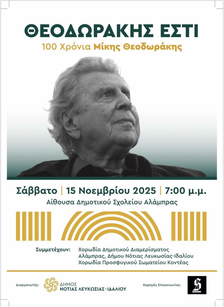 Two choirs will unite their voices—the Choir of Occupied Kontea and the Alambra Choir—along with three soloists, taking the audience on a carefully curated journey of songs divided into two realms: the heart and the struggle. The concert “Theodorakis Esti” is expected to leave an indelible impression on every listener, offering a unique and moving experience.