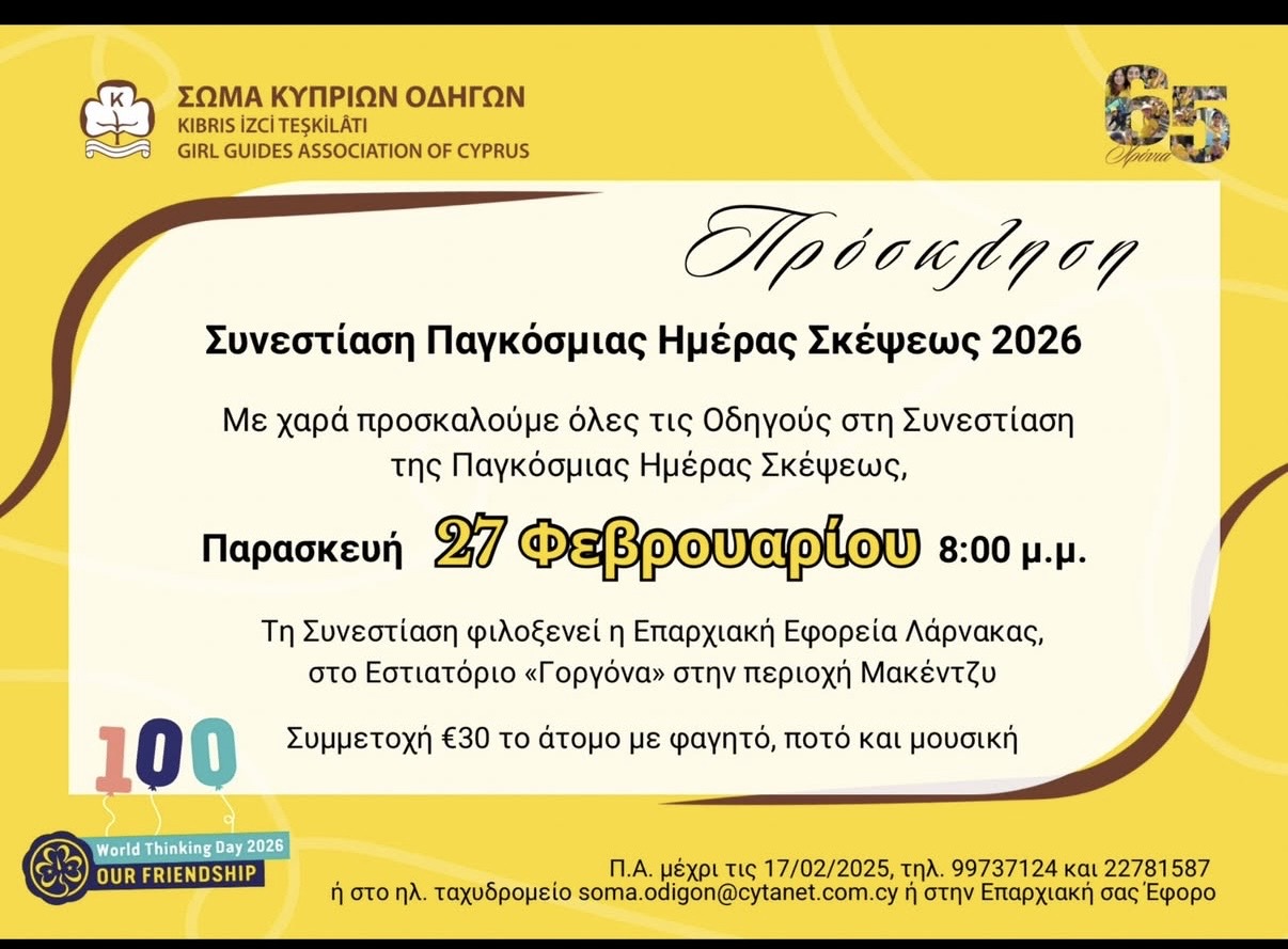 Όλες οι Οδηγοί προσκαλούνται στη Συνεστίαση της Παγκόσμιας Ημέρας Σκέψεως την Παρασκευή 27 Φεβρουαρίου στις 8:00 μμ.