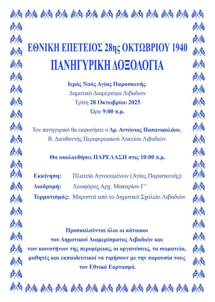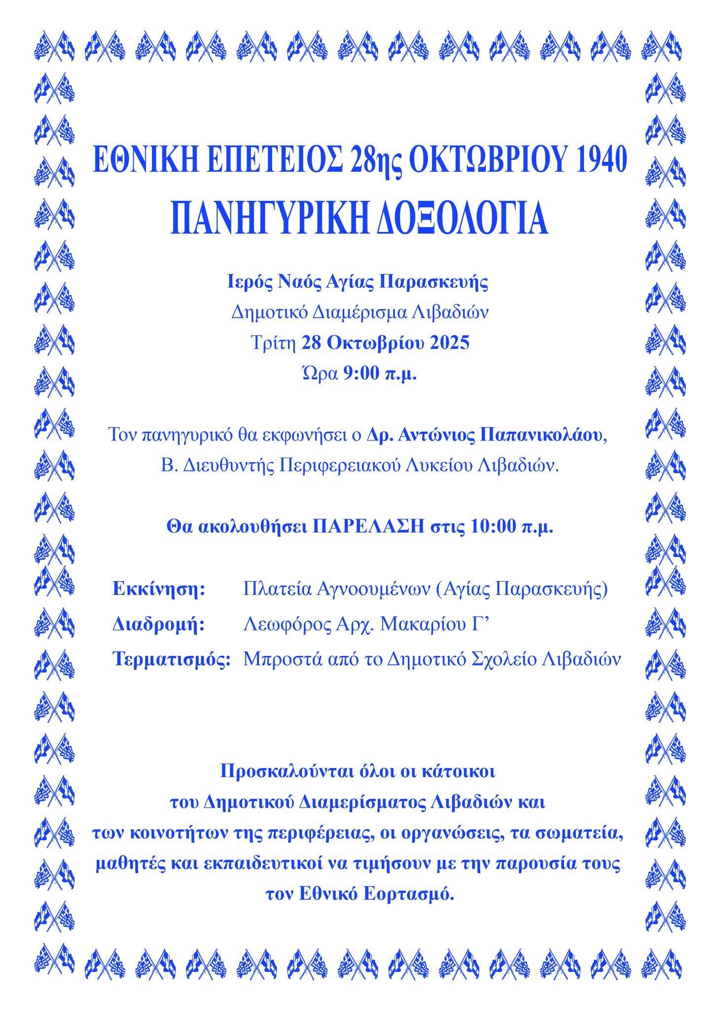 Residents of the Municipal District of Livadia, as well as neighboring communities, are invited to attend and honor this national celebration with their presence, reaffirming that the message of “Ohi” (“No”) remains alive in the hearts of all Greeks.