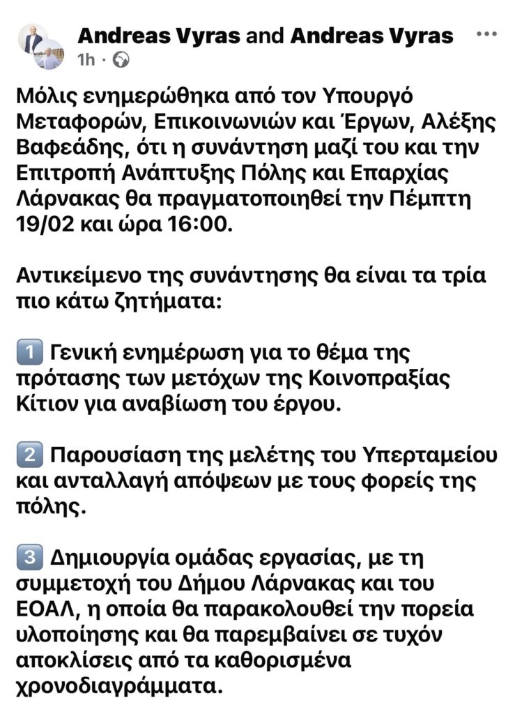 Μόλις ενημερώθηκα από τον Υπουργό Μεταφορών, Επικοινωνιών και Έργων, Αλέξης Βαφεάδης, ότι η συνάντηση μαζί του και την Επιτροπή Ανάπτυξης Πόλης και Επαρχίας Λάρνακας θα πραγματοποιηθεί την Πέμπτη 19/02 και ώρα 16:00.