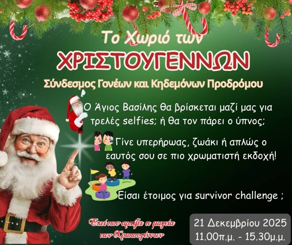 Ο Σύνδεσμος Γονέων και Κηδεμόνων Δημοτικού Σχολείου Προδρόμου στη Λάρνακα ανακοινώνει με χαρά τη μεγάλη χριστουγεννιάτικη εκδήλωση «Το Χωριό των Χριστουγέννων», που θα πραγματοποιηθεί το Σάββατο 21 Δεκεμβρίου 2025, από τις 11:00 π.μ. έως τις 15:30 μ.μ., στο Δημοτικό Σχολείο Προδρόμου στη Λάρνακα.