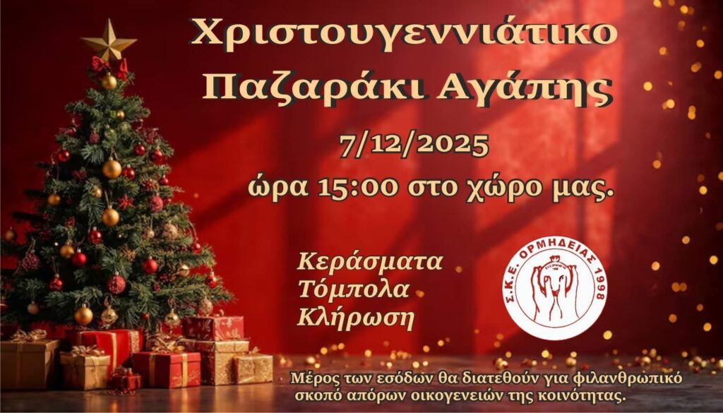 Η πιο όμορφη εποχή του χρόνου πλησιάζει και ο ΣΚΕ Ορμήδειας ετοιμάζει μια ξεχωριστή εκδήλωση που συνδυάζει το πνεύμα των Χριστουγέννων με την πραγματική προσφορά. Το Χριστουγεννιάτικο Φιλανθρωπικό Παζαράκι, που θα πραγματοποιηθεί την Κυριακή 7 Δεκεμβρίου 2025 στις 3:00 μ.μ., υπόσχεται να γεμίσει τον χώρο με χαμόγελα, ζεστασιά και αλληλεγγύη.