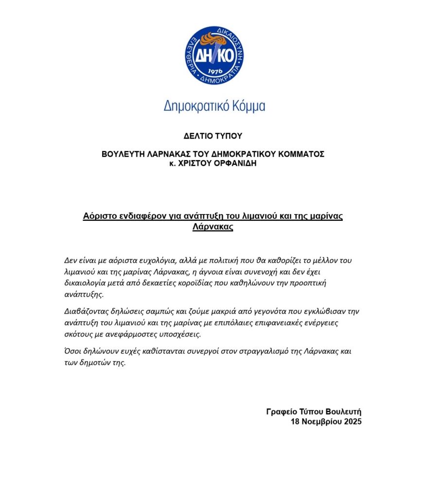 Congratulations to Mr. Orphanides, who continues to speak plainly, guided solely by the city’s best interests. We hope the other Larnaca MPs will also be mobilized soon.