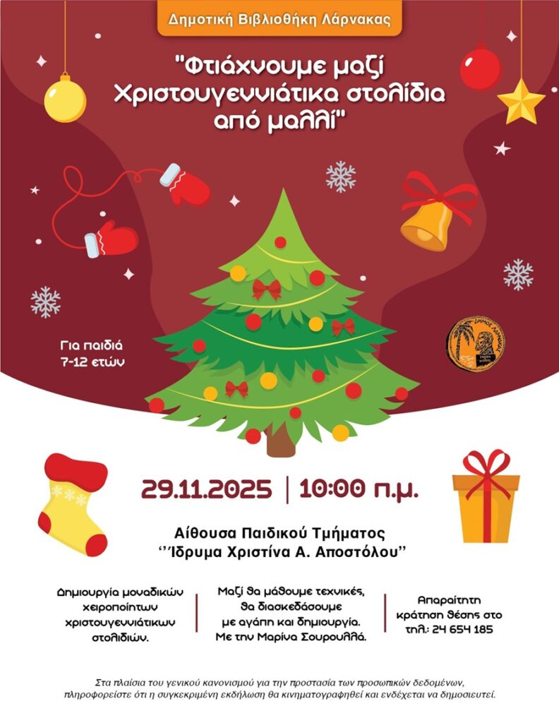 Муниципальная библиотека Ларнаки организует особую праздничную творческую мастерскую для детей в возрасте от 7 до 12 лет под названием «Создаём вместе рождественские украшения из шерсти». Мероприятие состоится в субботу, 29 ноября 2025 года, в 10:00, в Зале Детского Отделения Фонда «Христина А. Апостолу».
